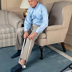 A simple, inexpensive device to assist with putting on stocking or sock. It consists of a strong, shaped, exible plastic gutter with long cotton tapes attached to the top. The stocking or sock is fed on to the plastic and held in place with the side notches. The foot is put in the open end of the stocking, which is then pulled over the foot and up the leg using the tapes. Cord length 920mm (36″). Gutter